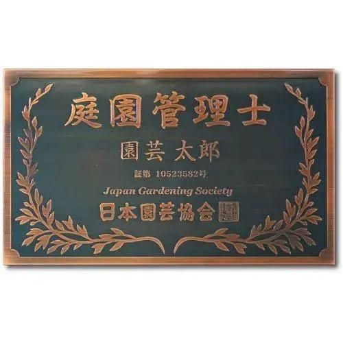 厚みと重量感のある高品質の純度99.9%以上の銅製看板です。エッチング技法を使い「庭園管理士」資格とあなたのお名前をくっきりと刻み、丹念に仕上げました。重量感と威厳を感じさせる銘板が、あなたが身につけた実力を雄弁に語ってくれます。玄関先だけではなく、室内で楯として飾ることもできます。