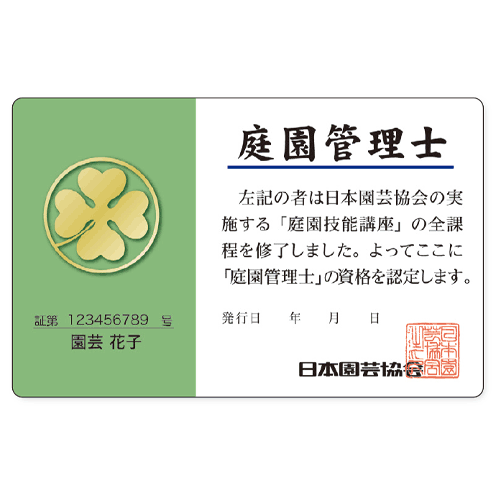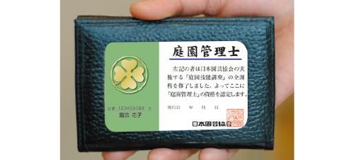 庭園管理士として活躍されるあなたの実力を証明します。サイズは運転免許証と同じサイズです。日本園芸協会と庭園管理士の文字を型押しした本革の特製ケース入りです。